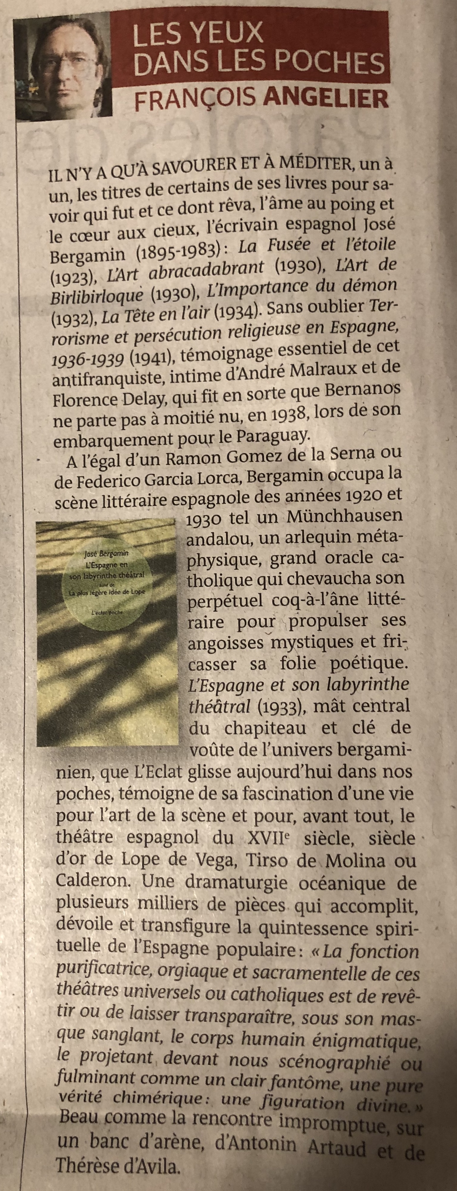 François Angelier a rendu compte dans Le Monde des Livres de cette semaine, du livre de José Bergamín, L’Espagne en son labyrinthe théâtral du XVIIe siècle qui a reparu en poche en septembre, traduit, présenté et annoté par Yves Roullière. «Beau comme la rencontre impromptue, sur un banc d’arène, entre Antonin Artaud et Thérèse d’Avila », écrit Angelier de ce livre très extraordinaire, qui résume le mieux l’œuvre de ce ‘toréador de la pensée’ que fut José Bergamín. On peut lire le compte-rendu, mené au trot enlevé, sur le site du Monde ou ici, sur une photo approximative, mais lisible.